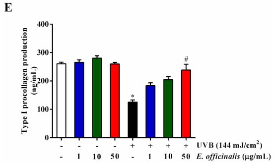 The MMPs are a family of Ca2+-dependent, Zn2+-containing endopeptidases that can break down most proteins within the ECM []. UVB irradiation and ROS production can activate MMP-1, which then cleaves all types of collagen and reduces the secretion of TGF-β1 []. TGF-β1 is a key cytokine that is involved in the synthesis of type I procollagen []. In our study, UVB-irradiation decreased TGF-β1 secretion, although without significant change. However, what was interesting was that E. officinalis (50 μg/mL) greatly promoted TGF-β1 secretion in UVB-irradiated cells. Furthermore, UVB irradiation increased the production of MMP-1 and MMP-3, whereas decreased the production of type I procollagen. However, we found that E. officinalis (50 μg/mL) downregulated MMP-1 and MMP-3 secretion and upregulated type I procollagen synthesis in UVB-exposed NHDFs. The effects of E. officinalis on the mRNA expression levels of type I procollagen and MMP-1 were also confirmed by RT-PCR analyses.