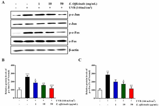 AP-1 is a vital downstream effector of the MAPK signaling pathway. Its family members include the c-Jun and c-Fos proteins. AP-1 regulates the production of MMPs, which control degradation in the ECM []. We used the Western blot technique to explore the inhibitive activity of E. officinalis on MMP levels through AP-1 transcription levels. As shown in Figure 7, UVB exposure enhanced the phosphorylation of both c-Jun (p-c-Jun) and c-Fos (p-c-Fos) by 275.4% and 397.8%, respectively. However, 50 μg/mL of E. officinalis treatment suppressed p-c-Jun by 52.0% and p-c-Fos by 60.8% compared to UVB-treated cells.