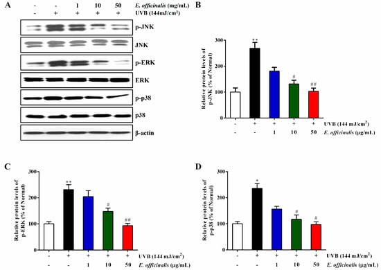 The activation of the MAPK signal transduction pathway affects AP-1 activation in a way that upregulates the production of the MMPs []. MMP-1 expression leads to collagen decomposition in the connective tissues, which ultimately causes reduced elasticity and wrinkle formation []. To understand the inhibitory actions of E. officinalis extract on MMP-1 expression, we investigated whether E. officinalis inhibits the phosphorylation of the upstream MAPKs. The levels of phosphorylated JNK (p-JNK), ERK (p-ERK), and p38 (p-p38) proteins were significantly elevated in the UVB-irradiated group compared to normal cells, and those elevations were attenuated by E. officinalis (Figure 8). The original Western blot images related to this article in triplicate have been shown in Figure S2.