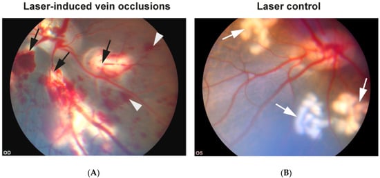 Funduscopic photos taken within 20 min after experimental retinal vein occlusion (RVO) was induced. (A) Eye with experimental RVO. By occluding four retinal veins a condition corresponding to central retinal vein occlusion (CRVO) was induced. Laser-induced occlusion resulted in dilation of the occluded vessels upstream of the occlusion sites. Flame-shaped hemorrhages developed shortly after vein occlusions were induced. Black arrows: Laser-induced occlusions. White arrow heads: Flame-shaped hemorrhages. (B) Control eye. Areas of laser applications were similar to the RVO eye. By ensuring that the laser burns in the control eye did not hit any vessels, no occlusions were induced. White arrows: Laser burns given without inducing occlusion.