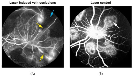 Fluorescein angiography. Angiography conducted five days after RVO. (A) Eye with RVO. Angiography revealed that no re-canalization of the occlusions occurred. Retinal ischemia was seen as dark areas of retinal non-perfusion. Yellow arrows: Sites of occlusion. Blue arrow: Retinal ischemia. (B) Control eye. Laser burns were created without inducing RVO. No retinal ischemia was observed. White arrow: Retinal changes after laser applications.