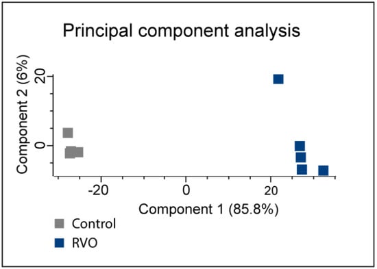 A total of 3791 proteins were successfully identified and quantified in all samples (Supplementary File S1). Unfiltered mass spectrometry data is provided in Supplementary File S2. A statistically significant change was observed in 147 proteins following experimental ischemic RVO. Among these proteins, 106 proteins were upregulated and 41 proteins were downregulated. The entire list of significantly changed proteins is given in Supplementary File S3. The principal component analysis (PCA) plot revealed that the proteome of ischemic RVO was highly different from laser controls (Figure 3).
