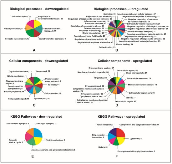 Gene Ontology analysis of differentially regulated proteins. Downregulated and upregulated proteins were analyzed as two individual groups. Numbers refer to the number of proteins that represented a given process, compartment, or pathway. (A) RVO resulted in a downregulation of proteins involved in visual perception. Downregulated biological processes also included processes related to neurotransmitter regulation and neurotransmitter transport as well as synaptic transmission. (B) Upregulated biological processes that were upregulated in RVO included response to wounding, wound healing, blood coagulation, and response to wounding. Nineteen upregulated proteins were involved in the inflammatory response in RVO (see also Table 3). (C) The analysis of cellular components indicated a downregulation of proteins pertaining to neuron part, photoreceptor outer segment, and neuron projection. (D) Gene ontology analysis of upregulated cellular components indicated that ischemic RVO causes extracellular changes. RVO resulted in an upregulation of extracellular space, extracellular exosome, and extracellular region. (E) Downregulated Kyoto Encyclopedia of Genes and Genomes KEGG pathways included GABAergic synapse, phototransduction, and glutamateric synapse. (F) KEGG pathways that were upregulated in ischemic RVO included complement and coagulation cascade, lysosome, and focal adhesion.