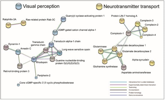Proteins involved in visual perception included rhodopsin, peripherin-2, arrestin C, cone cGMP-specific 3′,5′-cyclic phosphodiesterase (PDE6C), transducin alpha subunit, long-wave sensitive opsin, isoform 2 of cGMP-gated cation channel alpha-1 (CNGA1) and guanylyl cyclase-activating protein 1 (GCAP1) (Figure 5, Table 1).