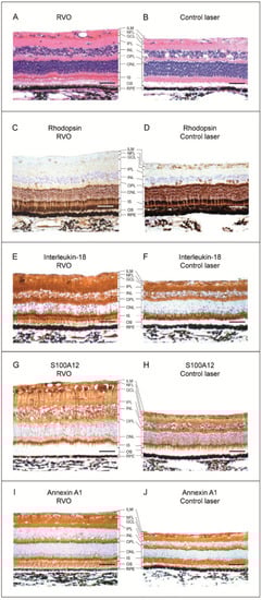 Histology and immunohistochemistry. Scale bar = 31 µm. Reaction color: brown. (A,B) Hematoxylin and eosin (HE) staining. In RVO complicated by ischemia, increased thickness was observed in the nerve fiber layer (NFL), the ganglion cell layer (GCL), the inner plexiform layer (IPL), and the outer plexiform layer (OPL). (C,D) In RVO, rhodopsin was downregulated in the outer nuclear layer (ONL), the photoreceptor inner segments (IS), and outer segments (OS). (E,F) Immunohistochemistry confirmed a general upregulation of IL-18 in ischemic RVO. (G,H) S100A12 was abundant in retinal ganglion cells in RVO. (I,J) ANXA1 was abundant in the inner retinal layers in RVO.