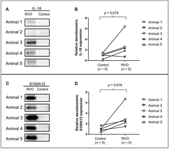 Western blot analysis of IL-18 and S100A12. (A) Protein content of IL-18 (approximately 22 kDa). (B) Densitometric data presented as the change of relative IL-18 expression between ischemic RVO and control samples, normalized to relative β-actin expression. Western blot analysis supported the data from mass spectrometry, though not statistically significant (p = 0.078). (C) Protein content of S100A12. (D) Densitometric data confirmed an upregulation of S100A12 in ischemic RVO (p = 0.016).