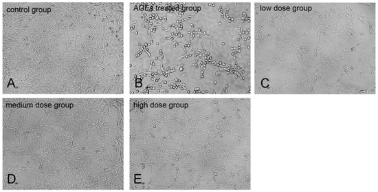 KM treatment protects against AGE-induced GMC injury. Microphotographs of the recovery effect of KM on AGE-induced growth of (A) control group GMCs, (B) cells treated with AGEs (160 μg/mL) for 24 h, and (C–E) cells pre-treated with 10, 20, or 35 μM KM and then stimulated with AGEs (160 μg/mL) for 24 h. The photographs were taken directly from culture plates with an inverted fluorescence microscope (magnification 100×).