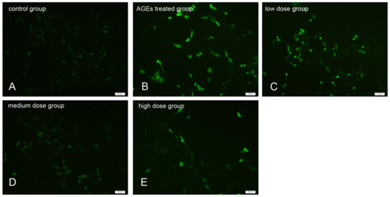 AGEs-BSA conjugation was prepared by incubating 5 g bovine serum albumin with 9 g D-glucose in 10 mL of phosphate buffer solution (PBS) (0.2M, pH 7.4) for 8 weeks at 37 °C and the free glucose was dialyzed in 0.01 M PBS (pH 7.4) for 96 h [50]. The identification of AGEs was determined at excitation 370 nm and emission 440 nm in a Gemini EM fluorescence microplate reader (Molecular Devices, Sunnyvale, CA, USA). The content of AGEs was determined using an AGEs ELISA kit [51].