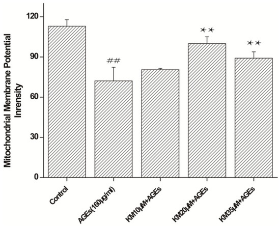 KM treatment improves mitochondrial membrane potential recovery in AGE-treated GMCs. Detection of the changes in mitochondrial membrane potential (∆Ψm) using rhodamine 123. GMCs were pre-treated with 10, 20, or 35 μM KM and then stimulated with AGEs (160 μg/mL) for 24 h. The results are presented as mean ± SEM. ** p < 0.01, vs. AGE group; ## p < 0.01, vs. control group.