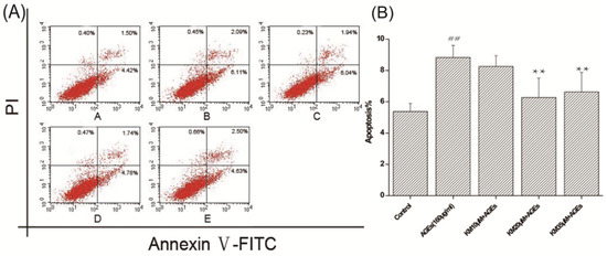 The rate of apoptosis was determined by annexin V and PI double staining [56]. After the GMCs were treated in groups according to Section 4.5, the cells were collected and centrifuged at 1000 rpm for 5 min at 4 °C. Following two PBS washes, the cells were resuspended in 100 μL 1X binding buffer containing 5 μL PI and 5 μL FITC-annexin V for 15 min in the dark. Then, 400 μL 1X binding buffer was replenished and the samples were analyzed using flow cytometry (BD Biosciences, Franklin Lake, NV, USA). A total of 10,000 cells were examined per sample, and both early (PI negative and annexin V positive stained cells) and late (PI positive and annexin V positive stained cells) apoptotic cells were analyzed.