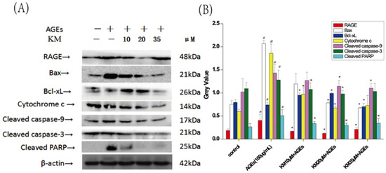 KM modulates the expression of both pro- and anti-apoptotic proteins in GMCs treated with AGEs. Effects of KM on AGE-induced apoptosis-related protein. GMCs were treated with AGEs (160 μg/mL) and KM (10, 20, or 35 μM). (A) The protein levels of RAGE, Bax, Bcl-xL and Cytochrome c, as well as the cleavage of caspases-9, -3 and poly-(ADP-ribose) polymerase (PARP), were examined by Western blot. + means adding reagents, − means not joining (B) The results were presented as mean ± SEM. * p < 0.05, vs. AGE group; # p < 0.05, vs. control group.