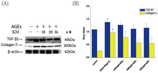 KM treatment reduces the proliferation of the ECM in AGE-treated GMCs. GMCs were treated with AGEs (160 μg/mL) and KM (10, 20 or 35 μM). (A) The protein levels of TGF-β1 and Collagen IV were examined by Western blot. + means adding reagents, − means not joining (B) The results were presented as mean ± SEM. * p < 0.05, vs. AGEs group; # p < 0.05, vs. control group.