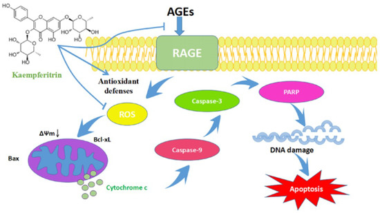 Hyperglycemia and OS can trigger an increase in Bax levels, which activates the apoptosis-signaling pathway, including the cleavage of both caspase-3 and caspase-9 [44]. AGEs-induced ROS production in the mitochondria results in cytochrome c release through the regulation of Bax and Bcl-xL [45,46,47]. Thus, cytochrome c could activate caspase-9 and caspase-3 and stimulate the proteolytic cleavage of PARP, resulting in morphological and membrane potential changes and subsequent mitochondrial and nuclear DNA damage [48,49]. In this study, we found that KM reduces the production of ROS and inhibits the AGE-induced apoptosis of GMCs (Figure 9).