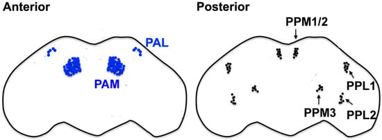 The dopaminergic (DA) neurons in the adult fly brain. Schematics of the seven major clusters of DA neurons located in the anterior and posterior brain [,,]. The protocerebral anterior lateral (PAL) and protocerebral anterior medial (PAM) clusters reside in the anterior brain. Major posterior clusters include the protocerebral posterior medial 1, 2, and 3 (PPM1, PPM2, and PPM3, respectively) and the protocerebral posterior lateral clusters 1 and 2 (PPL1 and PPL2, respectively).