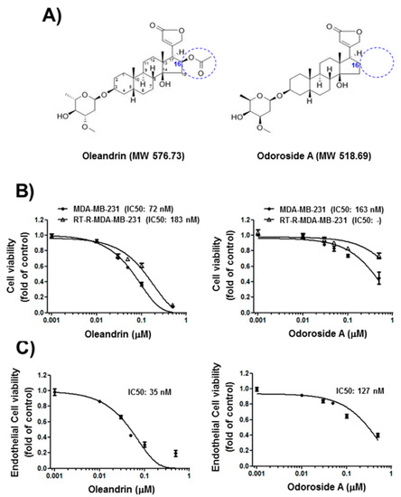 Cardenolides are steroidal compounds characterized by the presence of a five-membered unsaturated lactone ring at C17 that exhibits cardiotonic activity. Cardenolides, together with the bufadienolides, which contain an α-pyrone ring, compose the group of so-called cardiac glycosides. Arai et al. [46] compared the anticancer activity of various compounds isolated from Nerium oleander and reported that the sugar moiety at C3 is important for anticancer activity. In addition, when a double bond at C16 and C17 was introduced, the activity decreased, and the OH group at C8 also reduced the activity. The difference in structure between oleandrin and odoroside A involves the presence or absence of an acetoxy group at C16, which is not important in conferring significant anticancer activity. According to our results, odoroside A, which has no acetoxy group at C16, shows reduced toxicity to normal ECs as well as to breast cancer cells, such as MDA-MB-231 and RT-R-MDA-MB-231 cells, at nanomolar ranges compared to oleandrin.