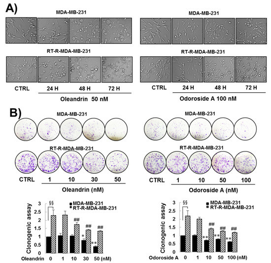 Effects of oleandrin and odoroside A on cell morphology (A) and colony formation (B) in MDA-MB-231 and RT-R-MDA-MB-231 cells. (A) Cells were treated with oleandrin (50 nM) and odoroside A (100 nM) for 24–72 h. Then, the morphologic changes of the cells were observed under a microscope (200×). (B) MDA-MB-231 and RT-MDA-MB-231 cells seeded in six-well plates (1000 cells/well) were treated with oleandrin and odoroside A at the indicated doses. After 24 h, the culture medium was discarded and replaced with fresh medium every 2–3 days. After 1–2 weeks, the cells were fixed, stained using crystal violet and counted. The values are expressed as the means ± SEM from three independent determinations. * p < 0.05, ** p < 0.01 compared with the control group of MDA-MB-231 cells; ## p < 0.01 compared with control of RT-R-MDA-MB-231 cells. §§ p < 0.01 between MDA-MB-231 and RT-R-MDA-MB-231 cells.