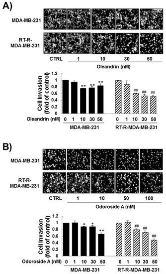 Next, we determined the effects of oleandrin and odoroside A on the invasion of MDA-MB-231 and RT-R-MDA-MB-231 cells through endothelial cells (ECs). Matrigel invasion assays revealed that oleandrin and odoroside A significantly inhibited cell invasion in a dose-dependent manner. Invasion was significantly inhibited by 1–50 nM oleandrin and by 1–100 nM odoroside A, which are doses lower than the IC50 values of these drugs for cell viability (Figure 3A,B).