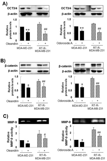 It has been reported that cancer stem cells (CSCs) exist in tumors and can be a cause of tumor resistance to chemotherapy and irradiation, contributing to cancer metastasis and cancer recurrence [42,43]. Our previous study reported higher expression of CSC markers and epithelial-mesenchymal transition (EMT) markers in RT-R-MDA-MB-231 cells than in MDA-MB-231 cells [44]. Thus, we investigated the effect of oleandrin and odoroside A on CSC marker levels and EMT protein levels. Western blot analysis showed that MDA-MB-231 and RT-R-MDA-MB-231 cells showed high protein levels of OCT3/4, a CSC marker, and β-catenin, an EMT protein. In addition, as expected, RT-R-MDA-MB-231 cells showed slightly higher expression levels of OCT3/4 and β-catenin than MDA-MB-231 cells, and the expression of these proteins was significantly inhibited by treatment with oleandrin (50 nM) and odoroside A (100 nM) for 24 h (Figure 4A,B). In addition, treatment with oleandrin (50 nM) and odoroside A (100 nM) for 24 h also effectively reduced MMP-9 activity in both MDA-MB-231 and RT-R-MDA-MB-231 cells (Figure 4C).