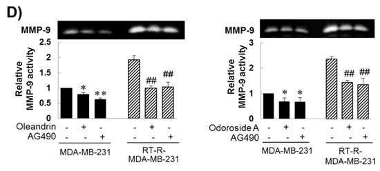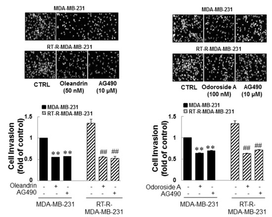 As mentioned in the Introduction, several studies have demonstrated that constitutive activation of STAT-3 occurs in a wide variety of tumors, including breast cancer, and participates in multiple cellular processes as well as in tumorigenesis. Thus, downregulation of STAT-3 has been suggested to overcome chemoresistance and radioresistance. Therefore, in this study, we investigated whether the anticancer effects of oleandrin and odoroside A in MDA-MB-231 and RT-R-MDA-MB-231 cells were mediated by modulation of the STAT-3 signaling pathway. Induced levels of phospho-STAT-3 in MDA-MB-231 and RT-R-MDA-MB-231 cells, but not those in ECs, (Figure 5A) were significantly reduced by treatment with oleandrin (50 nM) and odoroside A (100 nM) for 24 h, as shown in Figure 5B. The inhibitory effects of oleandrin (50 nM) and odoroside A (100 nM) on phospho-STAT-3 were the same as those of AG490 (a specific STAT-3 inhibitor). Moreover, AG490 significantly reduced the levels of OCT3/4 and β-catenin and the activity of MMP 9 in MDA-MB-231 and RT-R-MDA-MB-231 cells, effects that were similar to the inhibitory effects of oleandrin and odoroside A. Lastly, Figure 6 showed that STAT-3 inhibition by AG490 exhibited a similar effect of oleandrin (50 nM) and odoroside A (100 nM) on breast cancer cell invasion, indicating that the inhibition of STAT-3 phosphorylation by oleandrin and odoroside A mediates inhibition of breast cancer cell invasion.