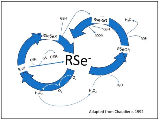 - Chaudiere, J.; Courtin, O.; Leclaire, J. Glutathione oxidase activity of selenocystamine: A mechanistic study. Arch. Biochem. Biophys. 1992, 296, 328–336. [Google Scholar] [CrossRef]