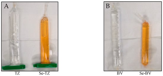 Redox selenium, as described in the Materials and Methods Section 4, was successfully conjugated to TZ and BV lysine residues using a modified Bolton-Hunter reagent. Conjugation resulted in an orange-red color in the final Se-antibody solution (Figure 2A,B).