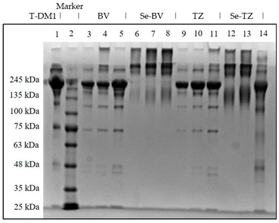 SDS-PAGE of Native and Se-conjugated mAbs under reducing conditions followed by Coomassie Blue R-250 staining. Lane 1: Kadcyla® 20 µg; Lane 2: Marker; Lane 3: BV 5 µg; Lane 4: BV 10 µg; Lane 5: BV 20 µg; Lane 6: Se-BV 5 µg; Lane 7: Se-BV 10 µg; Lane 8: Se-BV 20 µg; Lane 9: TZ 5 µg; Lane 10: TZ 10 µg; Lane 11: TZ 20 µg, Lane 12: Se-TZ 10 µg; Lane 13: Se-TZ 20 µg; Lane 14: Gamma globulin 20 µg. (BV: Bevacizumab, Se-BV: Selenobevacizumab, TZ: Trastuzumab, Se-TZ: Selenotrastuzumab).