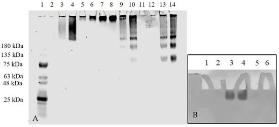 To assess other electrophoretic differences of the antibodies, at least two different concentrations In a second gel, two concentrations of TZ or BV were run on a 4–20% Tris-Glycine polyacrylamide gel electrophoresis (PAGE) under non-reducing conditions (Figure 4A). A trailing band was seen for Se-TZ and Se-BV similar to the trailing band of bovine gamma globulin. The results of Se-TZ and Se-BV show that the banding pattern was independent of the sample volume loaded across all the different samples. When no migration was seen for TZ in lanes 11 and 12 (Figure 4A), two concentrations of TZ and a protein ladder were loaded onto a 4–20% Tris-Glycine Gradient PAGE and run under non-reducing conditions with the electrophoretic migration pole charges reversed. TZ protein expression was then observed (Figure 4B).