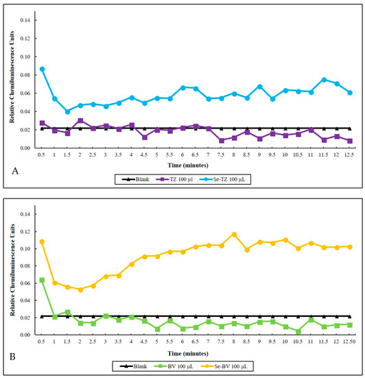 Lucigenin (Bis-N-Methylacridinium Nitrate) was used to detect superoxide in a chemiluminescent (CL) assay consisting of PBS pH 7.4 and reduced GSH. The amount of superoxide generated is proportional to the chemiluminescent light detected using a Turner TD-20e Luminometer (Turner Designs Inc., Mountain View, CA, USA), connected to a circulating water bath. The source of electrons for superoxide is from oxidized GSH catalyzed by selenite and selenides. Chemiluminescence (CL) measurements of BV, TZ, Se-BV and Se-TZ were performed in triplicates by adding 100 µL of BV, TZ, Se-BV or Se-TZ to 500 µL of the chemiluminescent cocktail at 37 °C with integrations of 30 s over 12.5 min, N = 25.