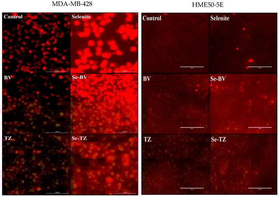 Photomicrographs of intracellular superoxide generation by DHE red florescence from MDA-MB-468 Cells (Left Panels) and HME50-5E cells (Right Panels). Results were photographed after 30 min of treatment with Control, selenite (10 µg Se), BV (153.7 µg protein), Se-BV (10 µg Se and 153.7 µg protein), TZ (131.1 µg protein), and Se-TZ (10 µg Se and 131.1 µg protein).