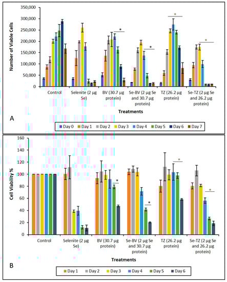 Analysis of cytotoxicity as a function of percent cell viability during treatment. (A) Cytotoxic effects of control, selenite, BV, Se-BV, TZ and Se-TZ Treatments against MDA-MB-468 cells. Forty-thousand cells were seeded in 48-well-plates and treated (Day 0 of treatment). Viable cells were counted for 7 days and analyzed by Trypan Blue exclusion. The data is expressed as Means ± SE (n = 3). Statistical treatments were compared using two sample t-tests. Treatments were considered statistically significant if p ≤ 0.05 and indicated by * (brown color). (B) Growth inhibition of control, selenite, BV, Se-BV, TZ, or Se-TZ treated MDA-MB-468 cells as determined by MTT assay over 6 days. Forty-thousand cells were seeded in 48-well-plates and treated (Day 0 of treatment). The data is expressed as the Means ± SE (n = 3). Treatments were compared using two sample t-tests. Treatments were considered statistically significant if p ≤ 0.05 (represented by * (black color)). Asterisks indicate significant differences between TZ and Se-TZ (A) and BV and Se-BV (B).