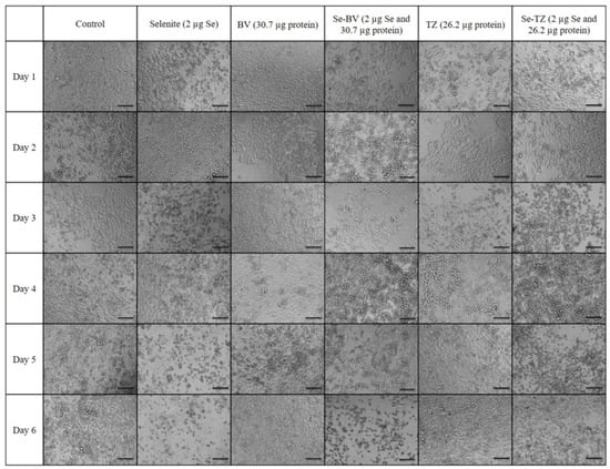 Inhibition of cell survival was examined by Trypan Blue exclusion starting immediately after treatment until Day 7 post treatment. The experimental treatments show that selenite, Se-TZ or Se-BV treated cells exhibit a general loss of viable cells over time as measured against control cells. To better understand the mechanism of cell death demonstrated by the Trypan Blue exclusion results, an alternative cytotoxic assessment assay of cell viability, i.e., the MTT assay (3-[4,5-dimethylthioazol-2-yl]-2-5-diphenyltetrazolium bromide) was performed, where the tetrazolium salt ring was cleaved by viable cells forming the insoluble Formazan. This method would also help address the question of cell viability in the cells when treated with Se-TZ or Se-BV. Our results showed that incubation of MDA-MB-468 cells with Se-TZ or Se-BV resulted in significant reduced proliferation by the MTT assay. These experimental results also appear to be confirmed by the optical assessment of altered cell morphology and detachment from substratum as photographed and shown in Figure 7 and Figure 8. This is indicative of apoptosis in the case of adherent cells []. Previous studies have established that selenium induces apoptosis by the intrinsic (mitochondrial-mediated) pathway [,,,]. Furthermore, apoptosis programmed cell death is associated with morphological, biochemical and molecular changes occurring in the cell []. From the results of Trypan Blue and MTT assays, we knew that the Se-immunoconjugates had an effect on cell membranes and mitochondrial activity.