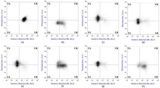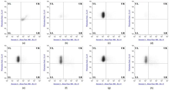 Se-Immunoconjugates induced no apoptosis in HME50-5E Cells. (a) Sutent (apoptosis control), (b) 0.1% Triton X-100 (necrosis) control), (c) Control untreated, (d) Selenite, (e) Bevacizumab, (f) Selenobevacizumab, (g) Trastuzumab, (h) Selenotrastuzumab treatments in HME50-5E cells. HME50-5E cells were stained with Annexin V/PI Mitotracker Red and subjected to flow cytometric analysis. The four quadrants represent—living cells (Upper Left; UL: Annexin V, Mitotracker Red), early apoptotic (Upper Right; UR: Annexin V, Mitotracker Red), late apoptotic (Lower Right; LR: Annexin V, Mitotracker Red) or necrotic (Lower Left; LL: Annexin V, Mitotracker Red) stages.