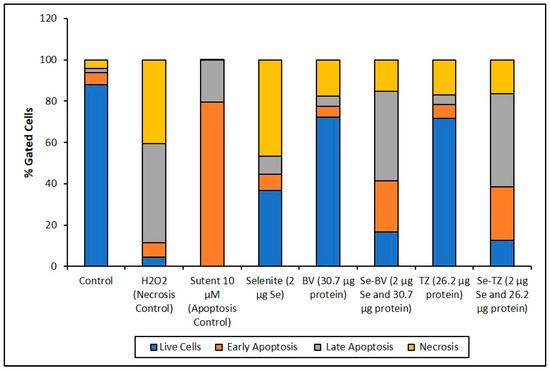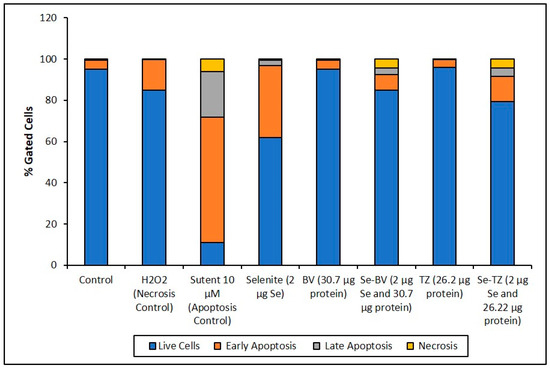 Cell representation (%) within the four quadrants for MDA-MB-468 cell treatments. Percent distribution of MDA-MB-468 apoptotic cells after treatment with H2O2, Sutent, Selenite as Se, Bevacizumab (BV), Selenobevacizumab (Se-BV), Trastuzumab (TZ), or Selenotrastuzumab (Se-TZ). Data is expressed as the Mean (n = 3).