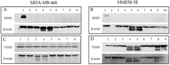 Western blot analysis of the expression level of human epidermal growth factor 2 (HER2) and vascular endothelial growth factor (VEGF) in MDA-MB-468 and HME50-5E cells treated with Selenite, Trastuzumab (TZ) and Selenotrastuzumab (Se-TZ). Total cell lysates were subjected to SDS-PAGE followed by Western blotting. Membranes were probed with the anti-HER2, anti-VEGF, or anti β-actin antibodies followed by peroxidase conjugated rabbit anti-mouse antibodies and visualization was performed by the enhanced chemiluminescence (ECL) detection system. (A) HER2 and MDA-MD-468 cells. Lane 1: BT474 as HER2 positive loading control; Lanes 2 and 3: Control; Lanes 4 and 5: Selenite (2 µg as Se) treatments; Lanes 6 and 7: TZ (26.22 µg as protein) treatments; Lanes 8 and 9: Se-TZ (2 µg as Se from 26.22 µg as protein) treatments. (B) HER2 and HME50-5E. Lane 1: BT474 as HER2 positive loading control; Lane 2: Molecular weight markers; Lanes 3 and 4: Control; Lanes 5 and 6: Selenite (2 µg as Se) treatments; Lanes 7 and 8: TZ (26.22 µg as protein) treatment; Lanes 9 and 10: Se-TZ (2 µg as Se from 26.22 µg as protein) treatments. (C) VEGF and MDA-MB-468 cells. Lanes 1 and 2: Control; Lanes 3 and 4: Selenite (2 µg Se) treatments; Lanes 5 and 6: BV (30.7 µg protein) treatment; Lanes 7 and 8: Se-BV (2 µg Se from 30.7 µg protein) treatments. (D) VEGF and HME50-5E cells. Lane 1: MDA-MB-468 as VEGF positive loading control; Lanes 2 and 3: Control; Lanes 4 and 5: Selenite (2 µg Se) treatments; Lanes 6 and 7: BV (30.7 µg protein) treatment; Lanes 8 and 9: Se-BV (2 µg Se from 30.7 µg protein) treatments.