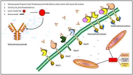Proposed model of Selanotrastuzamab action. The promiscuity of epidermal growth factor receptor (EGFR) family binding and interaction may be one possible explanation for the observed cytotoxicity in the triple negative breast cancer cells. It is possible for Selanotrastuzamab to interact with other family members, allowing for endocytosis of a critical amount of selenium-bound trastuzumab. The selenium might then become liberated within the cytosol and enter the mitochondria where it disrupts cancer cell metabolism and produces reactive oxygen specieis (ROS).