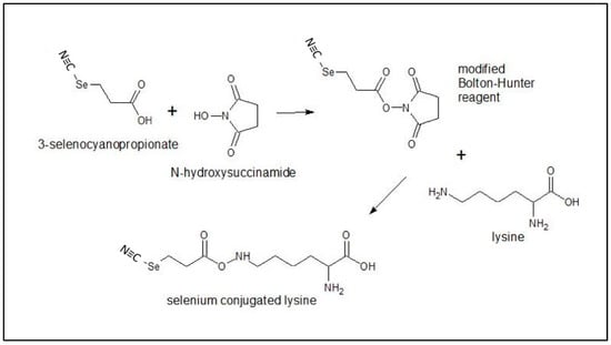 Selenotrastuzumab (Se-TZ) and Selenobevacizumab (Se-BV) were synthesized in-house using the selenium-modified Bolton-Hunter reagent. The covalent attachment of a redox active selenide to targeting proteins and monoclonal antibodies with the Se-Bolton-Hunter reagent is only a recent development []. The Se-modified Bolton-Hunter reagent was subsequently used to attach catalytic redox Se to lysine residues of TZ and BV. Figure 16 schematically shows the reactions.
