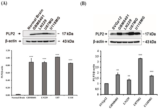 To evaluate PLP2 mRNA expression in human glioma cell lines, we applied quantitative RT-PCR on cDNA isolated from normal brain tissue and four different clones of glioma cell lines including GBM8401, LN229, U87MG, and U118MG. All glioma cell lines presented higher PLP2 mRNA expression than normal brain tissue cDNA. Of all glioma cell lines, the degree of PLP2 mRNA expression in LN229 and GBM8401 was higher than that in U87MG and U118MG (** p < 0.01; *** p < 0.001, Figure 2).