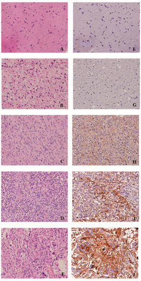 Hematoxylin and eosin staining of (A) normal brain tissue, (B) pilocytic astrocytoma, (C) diffuse astrocytoma, (D) anaplastic astrocytoma, and (E) glioblastome multiforme. IHC analysis of PLP2 in (F) normal brain tissue, (G) pilocytic astrocytoma, (H) diffuse astrocytoma, (I) anaplastic astrocytoma, and (J) glioblastoma. (Original magnification × 400).