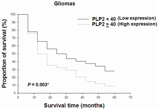 Relationships between overall survival rate and PLP2 immunostain scores in gliomas. Survival rates were analyzed using the Kaplan–Meier survival test (* p < 0.05).