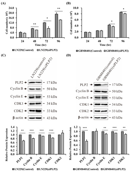 Analysis of (A) LN229 and (B) GBM8401 glioma cells proliferative ability after using small interfering RNA (siPLP2) to knockdown PLP2 expression. (* p < 0.05; ** p < 0.01); Using western-blot analysis to detect the cell-cycle checkpoints expression in (C) LN229 and (D) GBM8401 glioma cell lines after siPLP2 administration (** p < 0.01; *** p < 0.001).