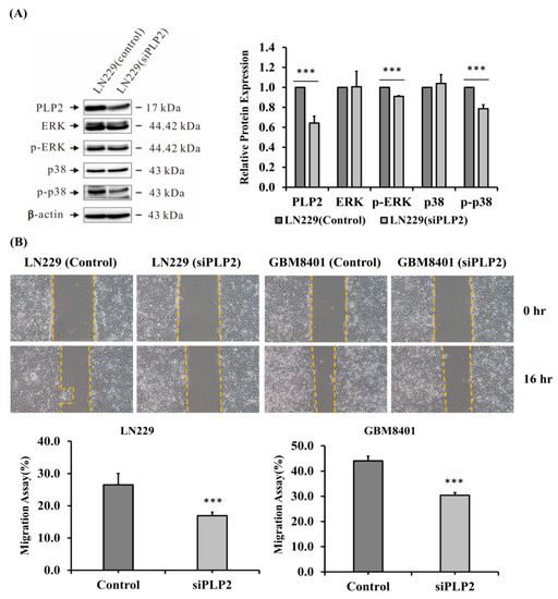 (A) Influence of the possible signaling pathway in the LN229 glioma cell line after siPLP2 and siRNA-A (NC)transfection. p-p38 and p-ERK showed a significant decrease after knockdown PLP2 expression. (*** p < 0.001); (B) Assessment of tumor migration ability in GBM8401 and LN229 glioma cell lines after siPLP2 and NC transfection. Glioma cells with a PLP2 knockdown revealed slow tumor migration after 16 h. (*** p < 0.001).