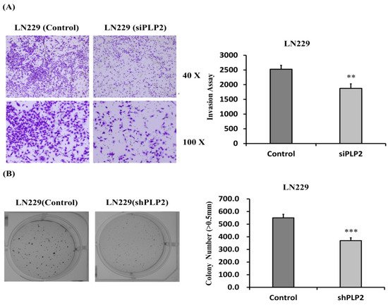 (A) The cell invasive ability in LN229 glioma cell line with siPLP2 transfection was lower than NC transfection after 24 h incubation; (B) Similarly, siPLP2 transfected LN229 glioma cells revealed lesser cell colonies then NC transfected tumors. (** p < 0.01; *** p < 0.001).