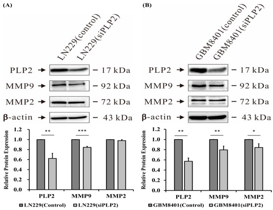 Since soft agar colony formation test is an ideal tool for quantitative assessing cancer cell proliferation and migration [43], we performed this assay to evaluate the ability for tumor tumorigenicity in gliomas with a PLP2 knockdown. Our results indicate that the LN229 glioma cells with short hairpin RNA (shPLP2) transfection produce significantly fewer cell colonies than cells transfected with an empty-vector (p < 0.001, Figure 7B). Therefore, the inhibition of PLP2 expression could effectively decrease glioma cell spheres formation. Besides, as the extracellular matrix degradation is an important factor for tumor invasion and metastasis, we also evaluated the possible influence of PLP2 expression and cell-matrix interaction. These data indicate that PLP2 knockdown could down-regulate matrix metalloproteinase 9 (MMP9) in LN229 and GBM8401 glioma cell lines, and matrix metalloproteinase 2 (MMP2) expression in GBM8401 glioma cell line (* p < 0.05; ** p < 0.01; *** p < 0.001, Figure 8).