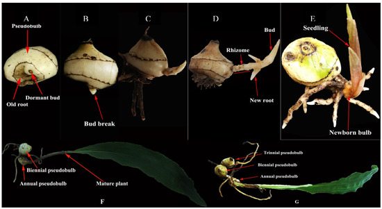 Pseudobulb string formation process: the pictures in (A–F) illustrate the development and growth processes of a newborn bulb. Annually, C. appendiculata forms into a biennial plant (F) through this development and growth process. Once per year, the biennial plant grows into a triennial plant through recycling (G). After repeated growth cycles, this plant forms a pseudobulb string.