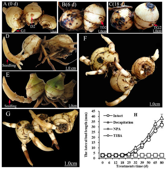The decapitation, NPA, and TIBA treatments promoted lateral bud outgrowth: (A–C) morphological pictures of the lateral buds at three representative time points (0, 6, and 18 days post-decapitation); (D–G) morphological pictures of decapitated and intact plants, and those treated with NPA and TIBA after for 80 days; and (H) the statistical chart of bud length. Values are means ± SDs, n = 3. Error bars indicate standard deviations obtained from three biological replicates.