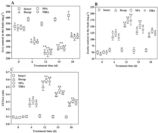 The phytohormone content of C. appendiculata lateral buds was tested during the bud elongation process by HPLC: (A) IAA; (B) zeatin; and (C) zeatin/IAA ratio. Values are means ± SD, n = 3. Error bars indicate the standard deviations obtained from three biological replicates. * and ** indicate significant differences based on one-way ANOVA tests at p < 0.05 and p < 0.01, respectively, compared with the intact group.
