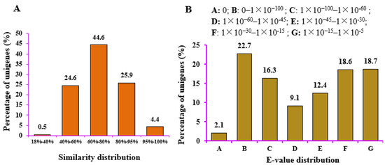 Characteristics of the similarity search of unigenes against the NR database: (A) similarity distribution of the top BLAST hit for each gene; and (B) E-value distribution of BLAST hits for each unigene with a cutoff E-value.