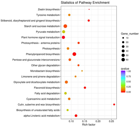 KEGG enrichments of the annotated differentially expressed genes (DEGs). The left Y-axis indicates the KEGG pathway. The X-axis indicates the rich factor (the number of genes enriched in this pathway compared to the number of genes on this pathway.). High q values are shown in blue, and low q values are shown in red.