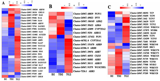 As shown in Figure 6, these genes were expressed with obvious selectivity. This phenomenon demonstrates that the different development stages have different gene expression signatures. At the TD2 stage, some metabolic enzyme genes of auxin are upregulated, such as the dioxygenase for auxin oxidation gene (DAO), which encodes 2-oxoglutarate-dependent-Fe (II) dioxygenase, and the IAA-amino acid hydrolase ILR1-like 6 gene (ILL6). The other DEGs are associated with auxin signal transduction, such as ARF18, GH3.11, SAUR32, and so on (Figure 6A). At the TG2 stage, more auxin-regulated DEGs are involved (metabolic: YUCCA2 and ILL7; transport: PIN3, PIN1, LAX2, and LAX3; signal transduction: ARF8, IAA27, AUX22E, etc.) than in TD2 (Figure 6A). At this stage, auxin synthesis and the polar transport capacity are enhanced. In contrast, the genes of cytokinin biosynthesis, such as IPT5 and CYP735A2, are highly expressed at the TD2 stage. The enzyme gene of the cytokinin transporter PURINE PERMEASE 11 (PUP11) is also upregulated at this stage. At TG2, there are more cytokinin signaling genes than at TD2, such as ARR15, ARR12, ARR9, ARR9, ARR8, ARR7, ARR3, AHK2, and AHK4. CKX5, which catalyzes the oxidation of cytokinins, is also upregulated (Figure 6B).