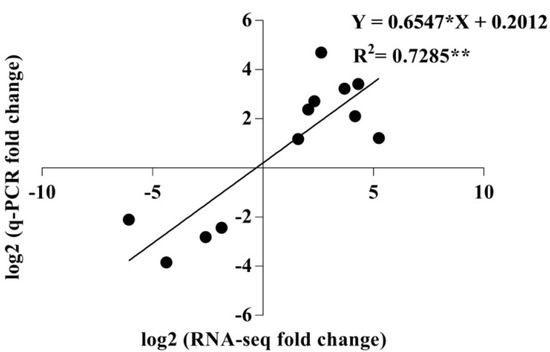 To validate the accuracy of the transcriptome analysis, 12 DEGs were randomly selected for real-time RT-PCR analysis. The correlation between the RNA-Seq and qRT-PCR results was analyzed using GraphPad Prism 7.0 software. There was highly significant correlation (r = 0.8535) between the qRT-PCR and RNA-Seq-generated data (p < 0.01) (Figure 7), indicating that the transcriptome analysis was precise.